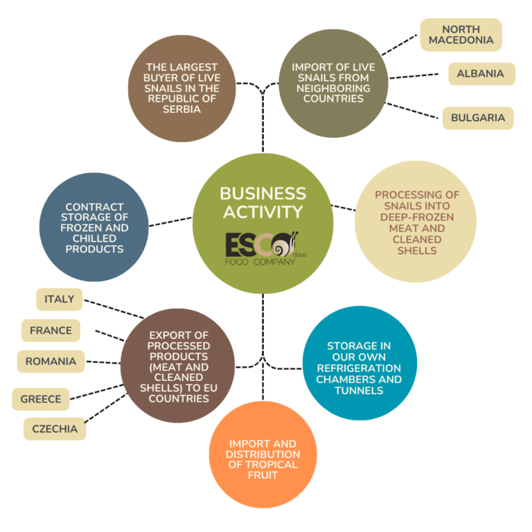 ESCO Ltd. Food Company – Smederevo was founded in January 2017 as a company with foreign capital, built on the tradition established by the renowned Greek families Prisnalis and Marinos. All technology, equipment, and expertise in snail processing as the core business, as well as in other animal and plant-based products, originate from the parent company, which has been engaged in this field for more than 55 years across Greece, Albania, Bulgaria, Hungary, North Macedonia, and Serbia, with exports of processed goods to EU countries.