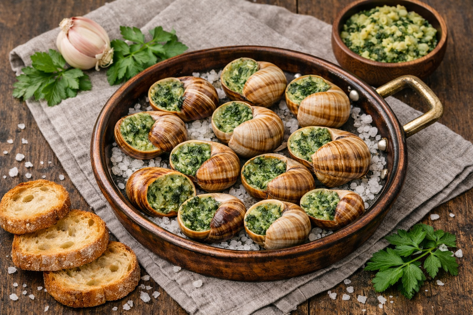 Preparation: Place the snail meat in a covered container and refrigerate overnight. The next day, wash the snails, put them in a pot, and cover with cold water. Add 5 tablespoons of salt and let stand for 30 minutes, stirring occasionally to draw out the mucus. Afterward, rinse the snails thoroughly and boil them again in salted water. Remove the snails from their shells and place them in a bowl. Add 3–4 cups of sea salt and cook for another 3–4 hours. Drain, remove from shells, and discard the dark part. Place one snail back into each shell and top with half a teaspoon of the prepared butter mixture. Sprinkle with coarse sea salt, place the snails on a baking tray, and bake in a preheated oven at 200°C for 10–12 minutes. Serve hot.