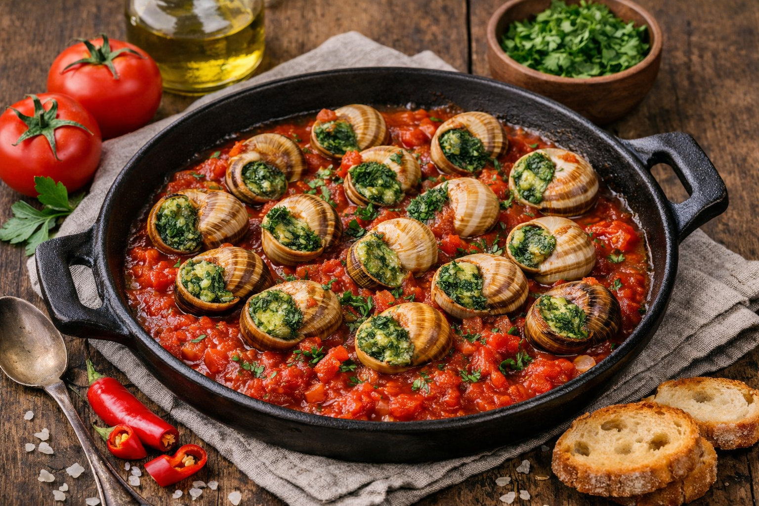 Preparation: Prepare the snails as described in the previous recipe (with butter and garlic). Sauté finely chopped onion for 2–3 minutes over medium heat, then add tomatoes, chili pepper, parsley, and other seasonings. Add the snails and mix with all ingredients. Cover and cook for about 15 minutes.