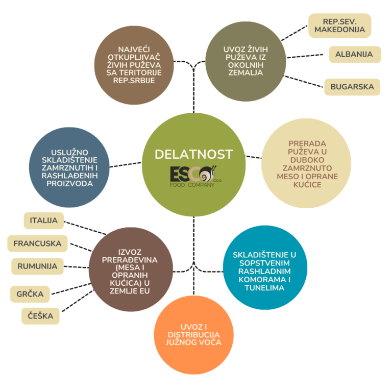 ESCO d.o.o. Food COMPANY – Smederevo, osnovana je u januaru 2017. godine kao kompanija sa stranim kapitalom, na temeljima tradicije koju su postavile ugledne grčke porodice Prisnalis i Marinos. Sva tehnologija, oprema i iskustvo u preradi puževa kao osnovne delatnosti ali i drugih animalnih i biljnih proizvoda, potiču iz matične firme koja se ovom delatnošcu bavi preko 55 godina na prostoru Grčke, Albanije, Bugarske, Madjarske, Makedonije i Srbije sa izvozom prerađevina u zemljama EU.